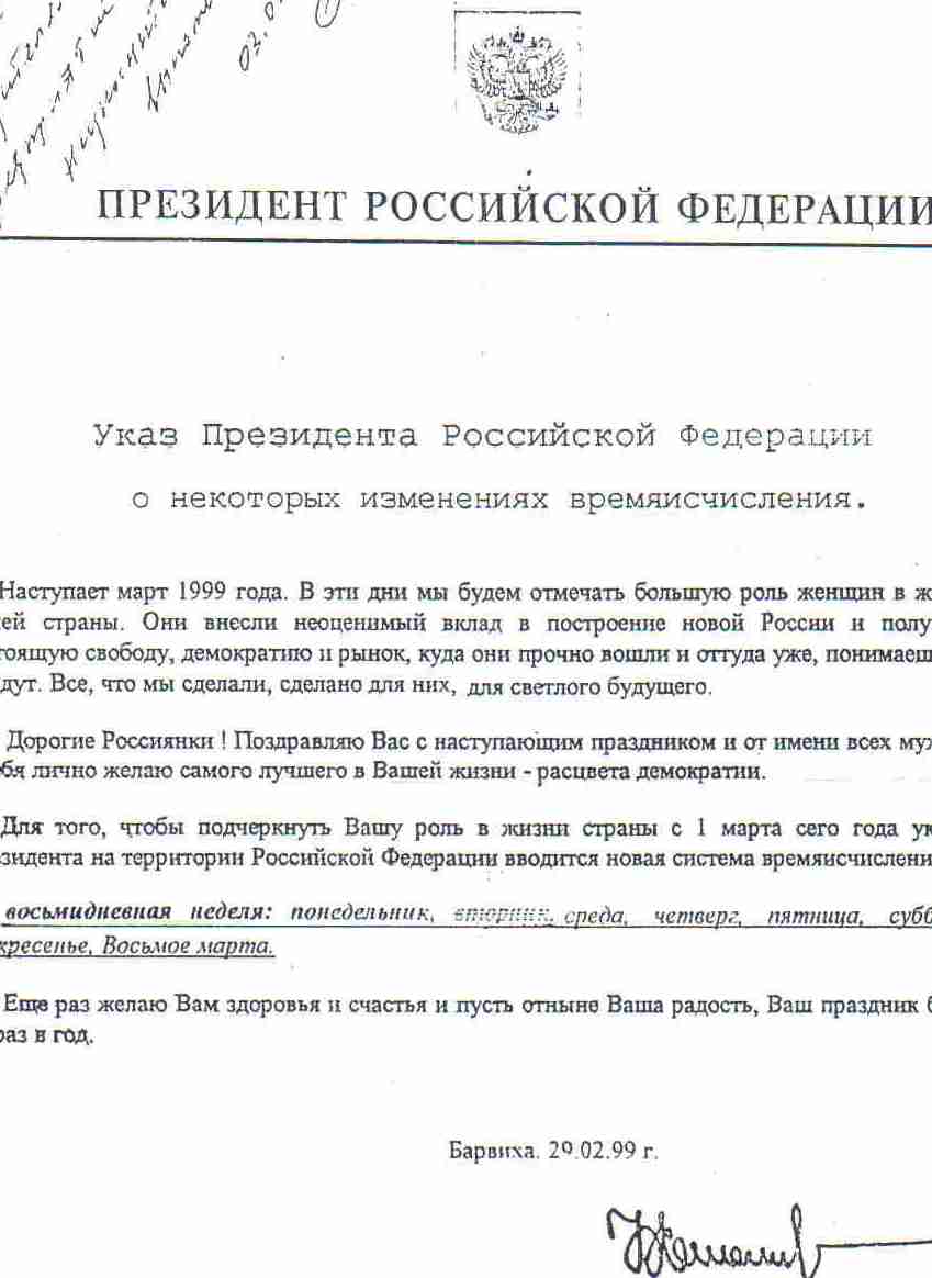 Для того, чтобы подчеркнуть Вашу роль в жизни страны, с 1 марта сего года указом Президента на территории Российской Федерации вводится новая система времяисчисления, - восьмидневная неделя: понедельник, вторник, среда, четверг, пятница, суббота, воскресенье, Восьмое марта.